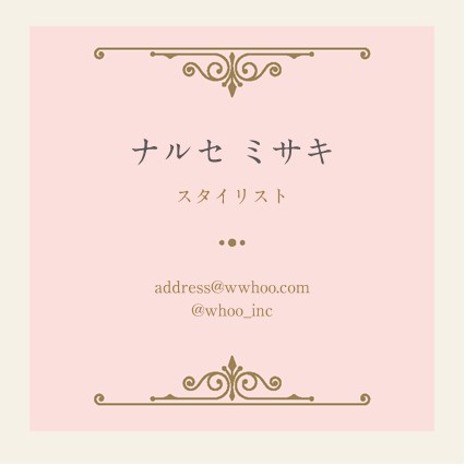 キュートな色使いに、華やかなフレームを合わせました。額縁のような中央のフレームを使えば、あなたのプロフィールが上品なシンボルとしてデザインされます。もしくはショップカードにも使いやすいでしょう。