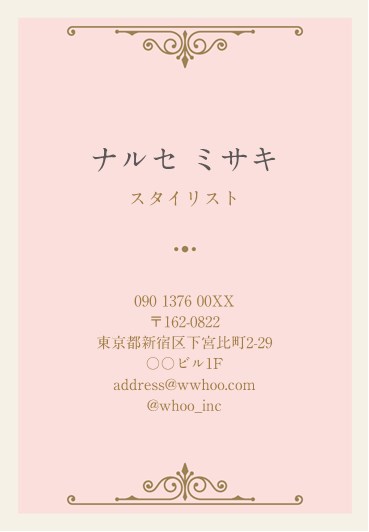 キュートな色使いに、華やかなフレームを合わせました。額縁のような中央のフレームを使えば、あなたのプロフィールが上品なシンボルとしてデザインされます。もしくはショップカードにも使いやすいでしょう。
